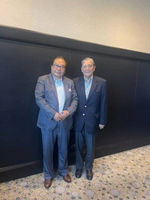 Xiao Wunan poses for a photo with prominent Peruvian politician Luis Alberto Taís Díaz (right)