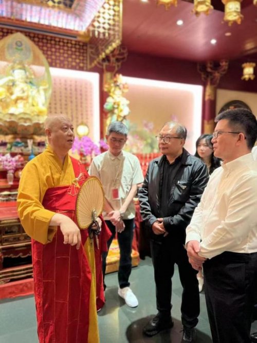 Venable Master Shi Fazhao (left) of Singapore's Buddha Tooth Relic Temple exchanges with guests including Xiao Wunan (second from right)