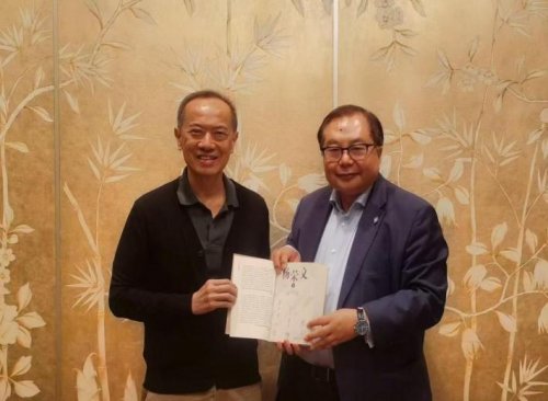 新加坡前外长杨荣文(左一)向肖武男赠送个人著作